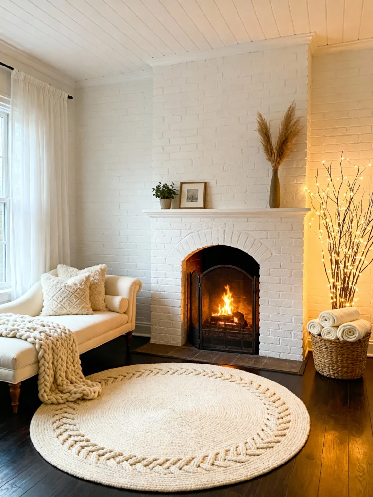 There is something so timeless about a white-painted brick fireplace. It’s clean, it’s classic, and it works with almost any decor. The arched opening of the firebox adds a little architectural interest, while the pampas grass and the basket of rolled-up blankets make it feel soft and inviting. I especially love the “twinkle light” branches in the corner—they add a magical sparkle that complements the fire perfectly.