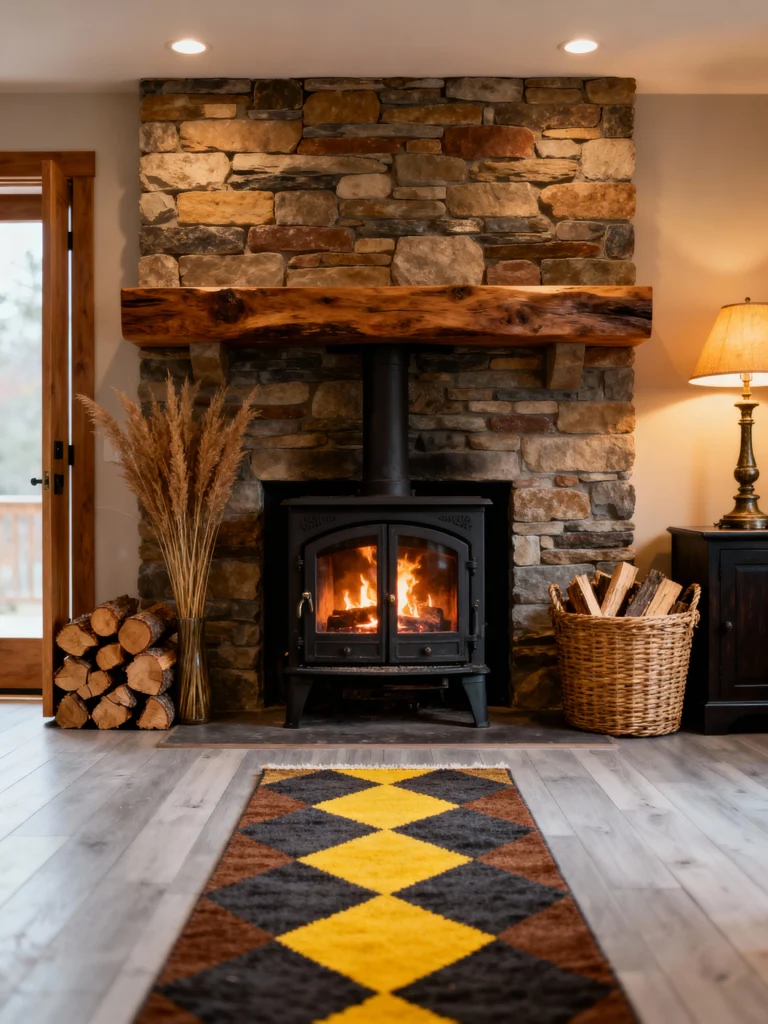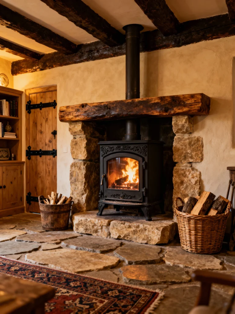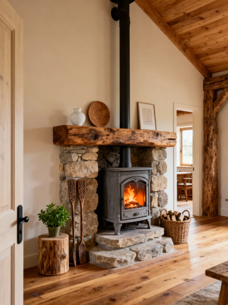 This one is for the true nature lovers. That massive, chunky wood mantel looks like it was salvaged straight from a historic barn! The stonework here has these beautiful, varied tones—rich browns, grays, and even hints of red. Pairing a traditional wood-burning stove with a basket of fresh logs and some tall dried pampas grass gives off such a warm, “mountain lodge” vibe. It’s the kind of place where you’d want to spend a rainy Sunday with a hot cup of cider.