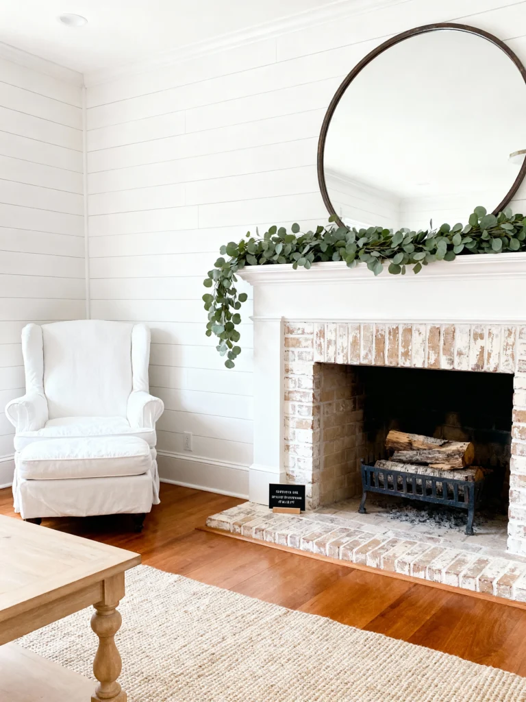 For those who want a bright, airy feel, this white-on-white aesthetic is a dream. The shiplap walls and the distressed “German smear” brickwork on the fireplace give it that perfect Modern Farmhouse character. The oversized round mirror is a genius move—it reflects the light and makes the room feel twice as big. Throw a long eucalyptus garland across the mantel, and you’ve got a look that feels fresh all year round.