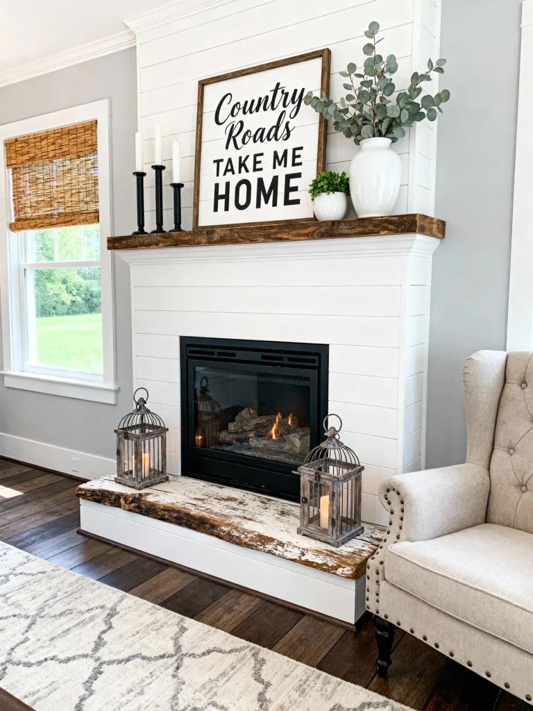Clean lines meet country charm. I love the “Country Roads” art—it really sets the mood for the whole house. The white shiplap fireplace surround looks so sharp against the dark insert. Using those vintage-style lanterns on the hearth instead of traditional tools is such a clever styling tip. It’s a great example of how you can take a traditional feature and make it feel totally current with the right accessories.