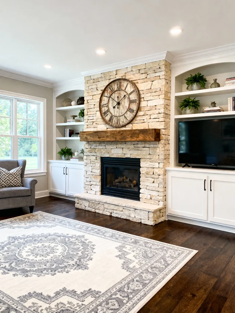 This is “Modern Traditional” at its finest. The stone fireplace is flanked by built-in white cabinetry, which is great for showing off your book collection or favorite pottery. That oversized wooden clock is a total showstopper! It fills the space above the mantel perfectly without making it feel cluttered. The cool gray tones in the rug and the walls keep the room feeling sophisticated and ready for entertaining guests.