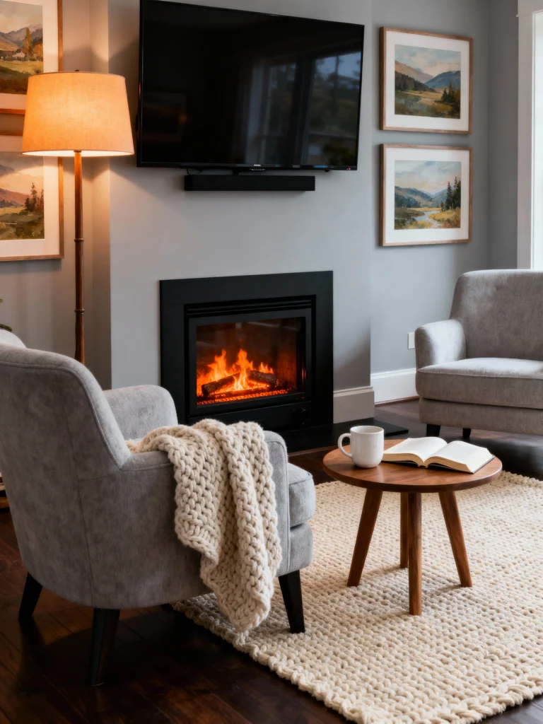 Sometimes you don’t need a massive stone wall to make an impact. This setup is all about comfort. The simple, dark fireplace surround built into a soft gray wall looks so elegant. What really makes this work is the “hygge” factor—that chunky knit blanket thrown over the armchair and the warm glow from the floor lamp. It’s a small, intimate setup that proves you can turn any wall into a sanctuary.