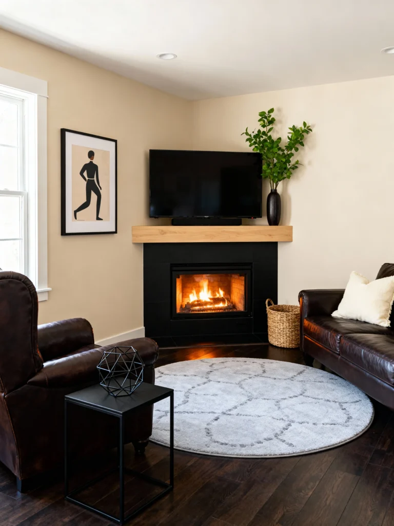 Got a tricky corner? This is your solution. This modern corner fireplace uses black tile to create a bold, dramatic focal point that contrasts beautifully with the light tan walls. The light wood mantel keeps it from feeling too heavy. It’s a very smart use of space, allowing for a large leather sofa and a cozy armchair to circle around the fire without the room feeling cramped. Very “urban-meets-cozy.”