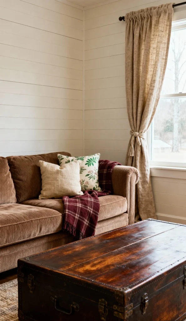 Cabin Chic Talk about a cozy spot to curl up! This brown corduroy sofa looks unbelievably soft and inviting. The horizontal white shiplap walls keep the room feeling bright and open, even with the rich colors of the couch and the dark, vintage-style trunk being used as a coffee table. The neutral and nature-patterned throw pillows, combined with the deep red plaid blanket, add layers of comforting texture. The simple, tie-back linen curtain lets in just enough light while keeping things warm and private—a perfect cabin aesthetic!