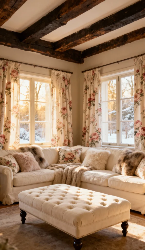 Snowy Romance Even with snow outside, this room feels incredibly warm and romantic! The plush, white sectional and ottoman combination looks like a cloud of comfort. Those ceiling beams add a gorgeous rustic contrast and bring down the visual height. But the real star is those beautiful floral curtains—they add such a soft, feminine cottage feel against the winter landscape outside. The furry pillows and soft throws just make it look like the most luxurious place to watch the snow fall.