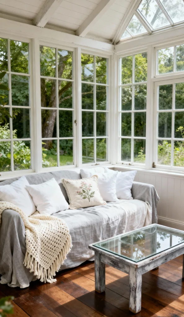 Garden Solarium This sunroom is a dream! Those huge, paneled windows truly make you feel like you’re sitting right in the garden—the view is incredible. The simple, linen-draped couch with all those white pillows and the lovely crocheted throw looks incredibly restful. The rustic, distressed white coffee table with the glass top is a great choice, allowing the sunlight to shine right through. It’s the perfect spot for a lazy Sunday morning, enjoying the fresh air and greenery without actually being outside.