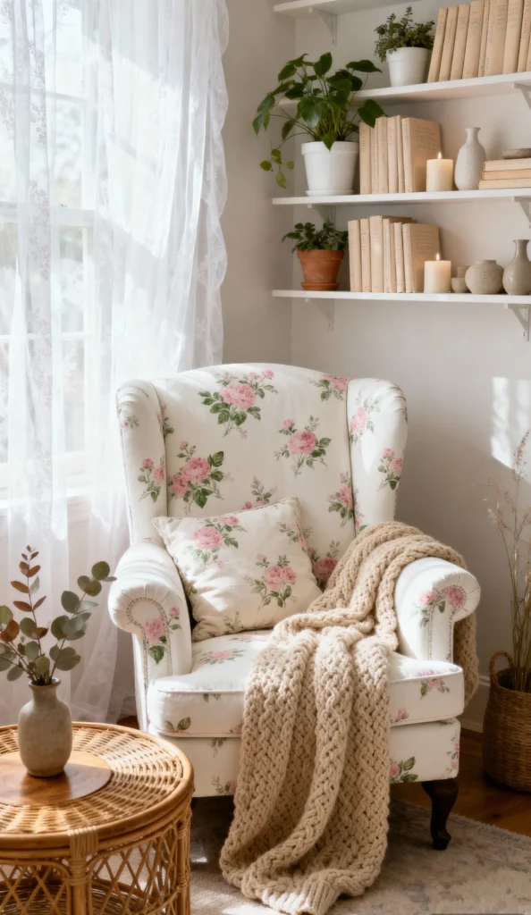 Shabby Chic This corner is the epitome of Cottagecore elegance! That floral upholstered wingback chair is just darling, especially paired with the chunky knit, neutral throw. It’s the perfect spot for reading, surrounded by soft light filtering through the sheer lace curtain. The open shelves are styled beautifully with simple white pots, trailing greenery, and stacks of vintage-looking books—so charming. The wicker side table adds a lovely, earthy touch, making it a truly idyllic little sanctuary.