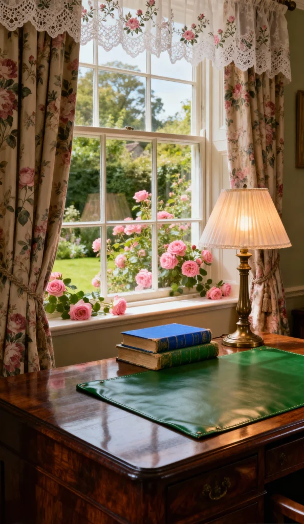 Rose Desk What an inspiring place to work or write! The view out the window, framed by those romantic floral curtains with the charming lace trim, is just stunning—roses blooming right up to the sill! The rich, dark wood desk adds a classic, sophisticated element, and the brass lamp provides a warm, focused light. Stacks of antique-looking books and the green leather desk pad complete the traditional, cozy library feel. It’s the kind of spot where you could feel productive and peaceful at the same time.
