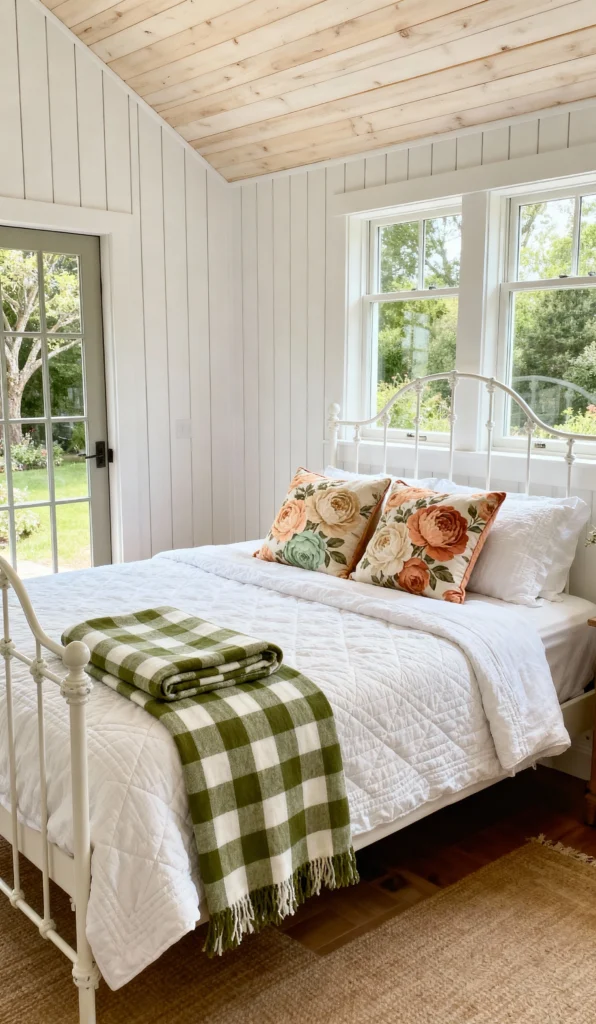 Simple Retreat This bedroom is the picture of clean, simple comfort. The white shiplap walls and pale wood ceiling give it that classic, airy cottage feel. The white metal bed frame is so charming, and the whole look is tied together by that lovely, folded green and white plaid throw—it’s such a fresh accent! The floral throw pillows add a soft, romantic touch. Imagine waking up here and stepping out through that glass door into a sunny garden! Pure, peaceful tranquility.