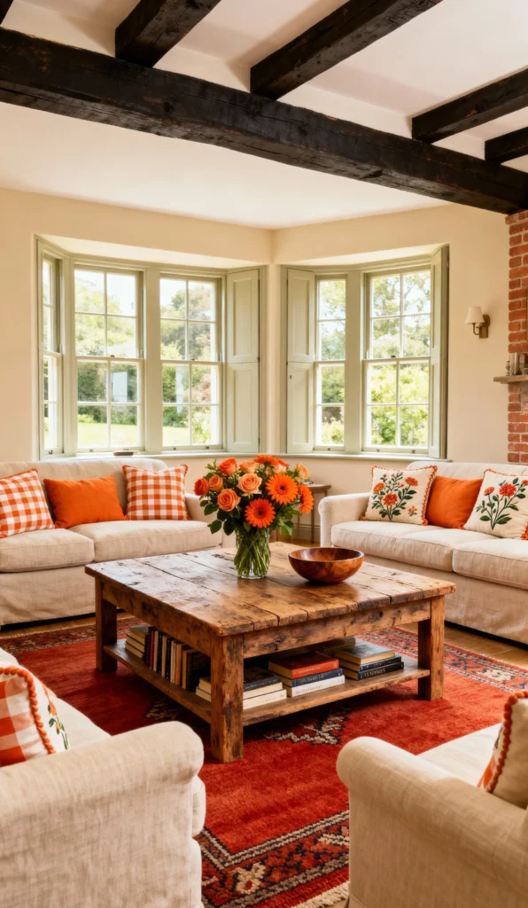 Cheerful Farmhouse How vibrant is this room? The burst of orange from the pillows and the gerbera daisy centerpiece is so uplifting against the neutral sofas. Those light green window frames really pop and bring the outdoors in, too. I adore the dark wooden ceiling beams which add a classic farmhouse depth. And, of course, that gorgeous, chunky wood coffee table is filled with books—perfect for a cozy afternoon of browsing. It’s a sophisticated take on rustic charm with a playful, sunny twist!