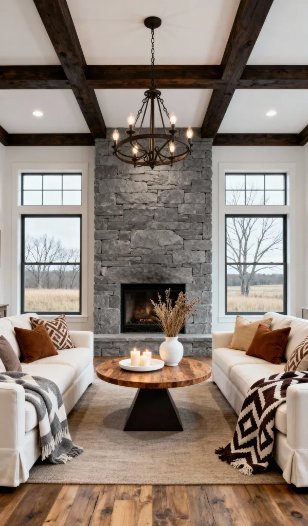 Structured Warmth This space perfectly bridges rustic and modern styles. The striking stone fireplace is definitely the focal point, flanked by clean-lined windows and anchored by dark, coffered ceiling beams. The matching white sofas keep the look crisp, while the geometric and solid-colored accent pillows in warm browns and rusts add a cozy, earthy touch. That round wooden coffee table is beautiful, and the entire setup feels balanced, modern, and incredibly inviting—a great take on contemporary farmhouse.