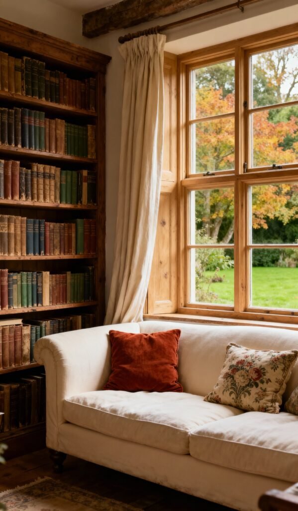 This is the ultimate reading spot, right? Look at that incredible, built-in wooden bookshelf overflowing with well-loved, leather-bound classics—it adds so much warmth and character. The plush, cream-colored sofa is practically begging you to sink into it, especially with that gorgeous, deep burnt-orange velvet cushion. I love how the wooden window frame perfectly captures the view of the autumn-colored trees outside. Imagine the natural light pouring in while you’re curled up here, curtains drawn just so. It feels historic, intimate, and absolutely perfect for a weekend afternoon.