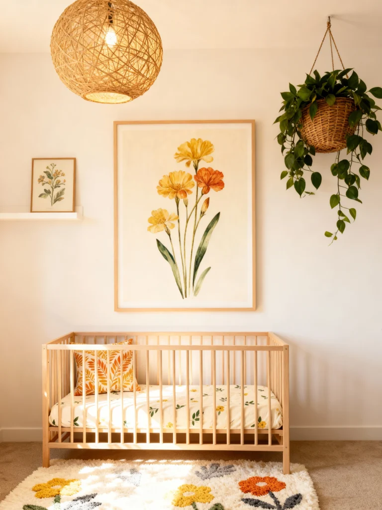Sometimes, all you need is one oversized piece of art to anchor a room. This large floral print is so elegant. I love how it’s balanced by the hanging pothos plant on the other side—it creates a nice visual symmetry. The light wood crib and the fluffy floral rug keep the room feeling light and spacious. It’s simple, clean, and totally timeless.