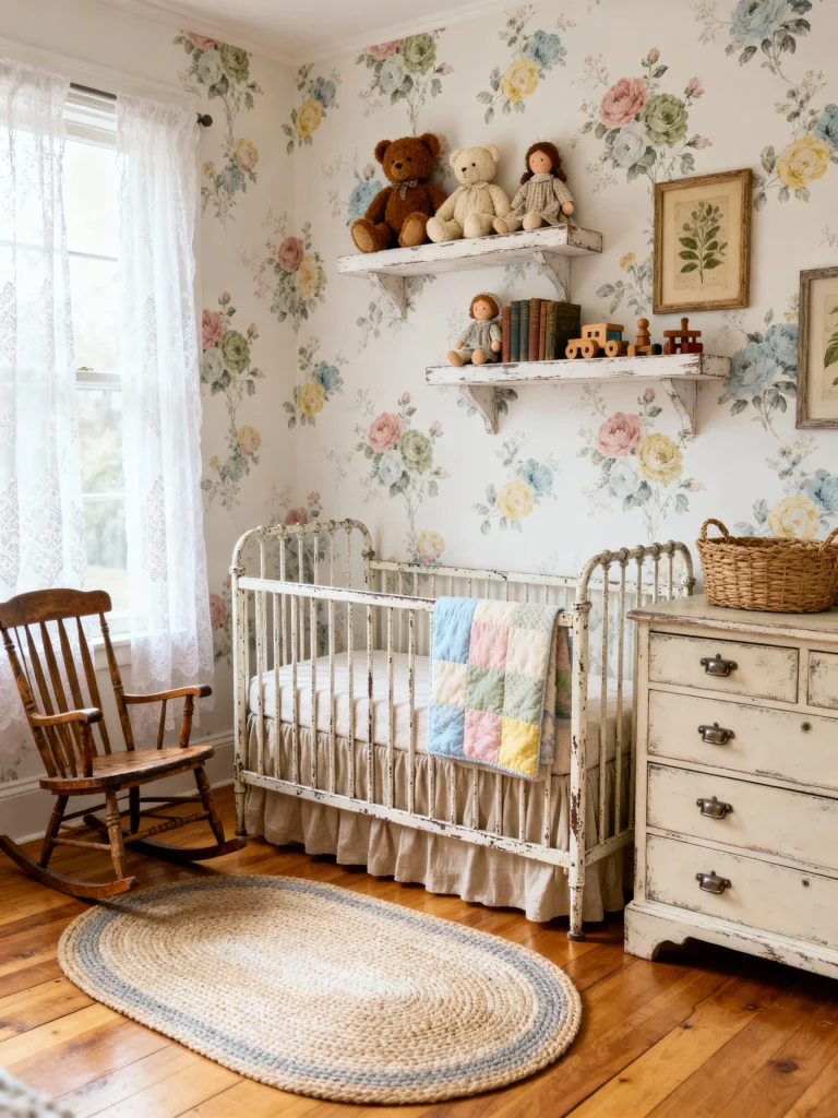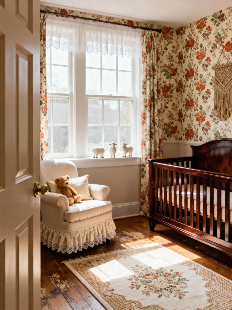 This room feels like a warm hug from the past. The floral wallpaper is stunning—it’s got that classic, slightly moody vibe that pairs so well with the lace-trimmed armchair. Can’t you just imagine rocking a little one to sleep here? The little sheep figurines on the windowsill are the cutest finishing touch. It’s proof that “old-fashioned” can feel totally sophisticated and cozy.