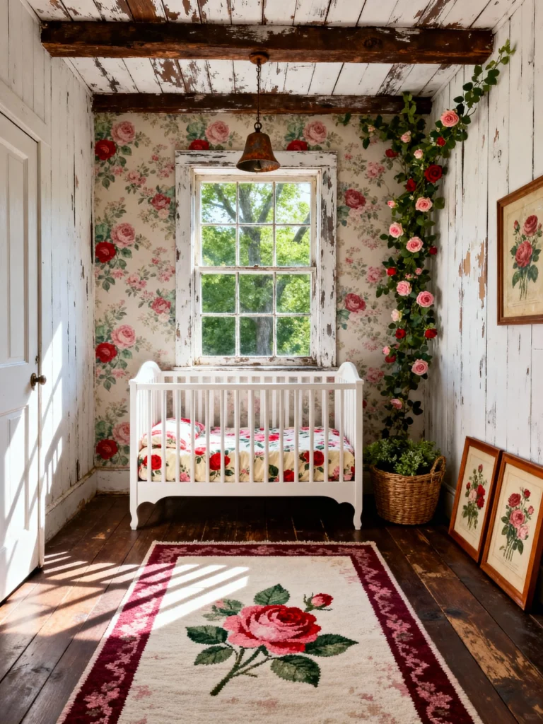 Okay, can we talk about these climbing roses? This is pure cottagecore magic. If you have a smaller, narrow space, this shows how much personality you can pack into it. The mix of the white-washed wooden walls and that bold rose wallpaper creates such a beautiful contrast. It feels like a little hideaway tucked inside a fairytale book. The floral rug pulling those red tones from the walls is just the icing on the cake.