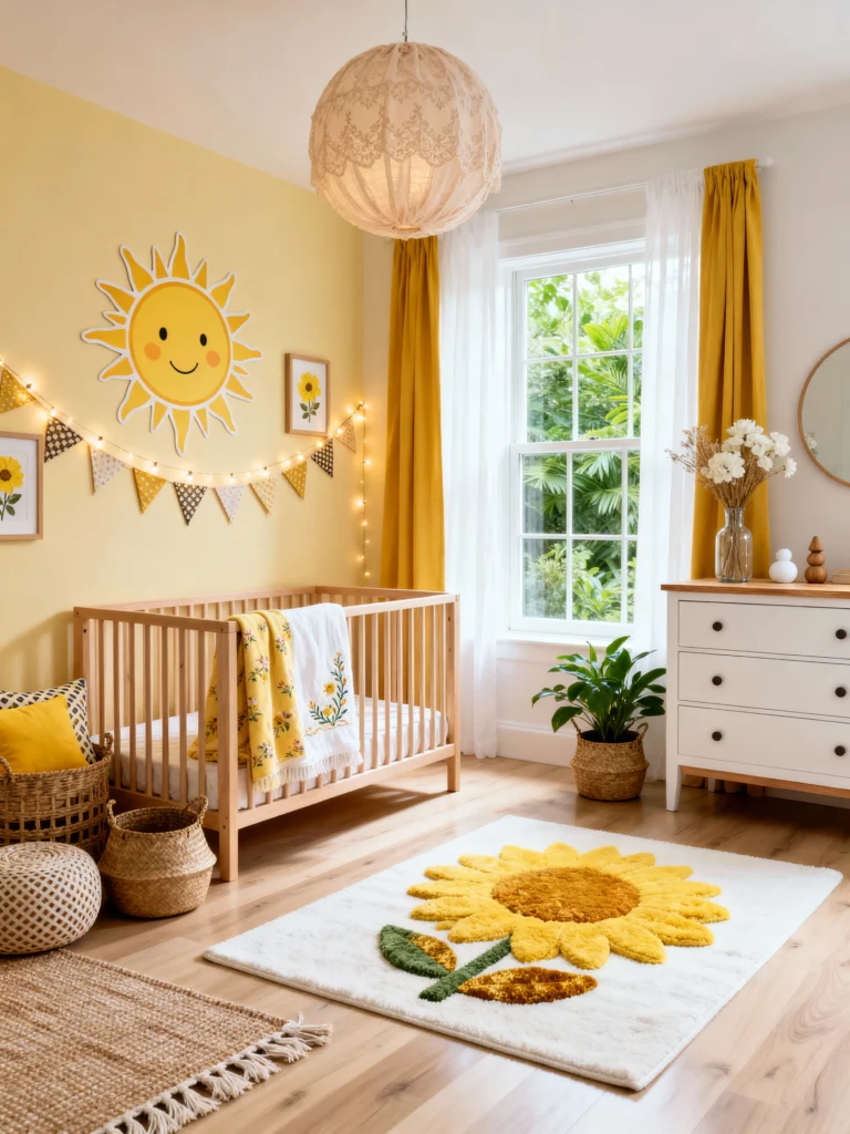 This room literally feels like sunshine. The soft yellow accent wall is cheerful without being overwhelming, and those mustard yellow curtains add such a pop. I love how they used woven baskets for storage—it keeps the room looking tidy but natural. It’s a bright, airy space that’s bound to start every morning on a high note.