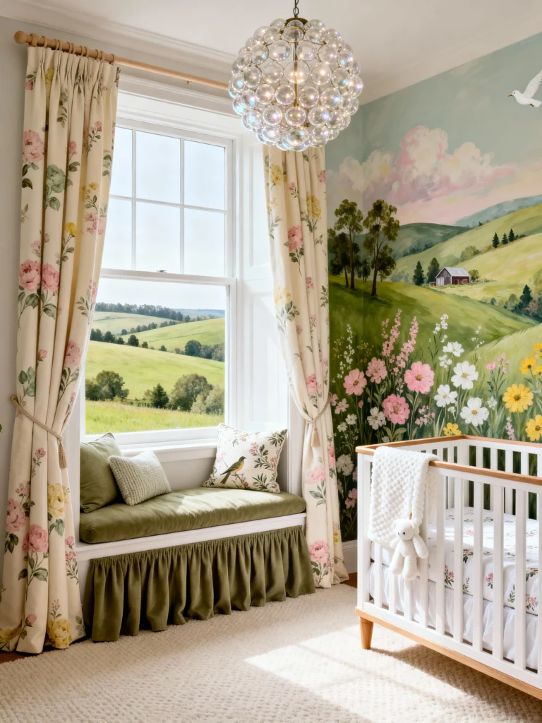 I am completely floored by this landscape mural. It literally brings the outdoors in! If you aren’t lucky enough to have a view of rolling hills, why not just paint them? The window seat with the olive green ruffles looks like the perfect spot for storytime. Everything about this room—from the bubble chandelier to the floral curtains—feels luxurious yet whimsical. It’s a total showstopper.