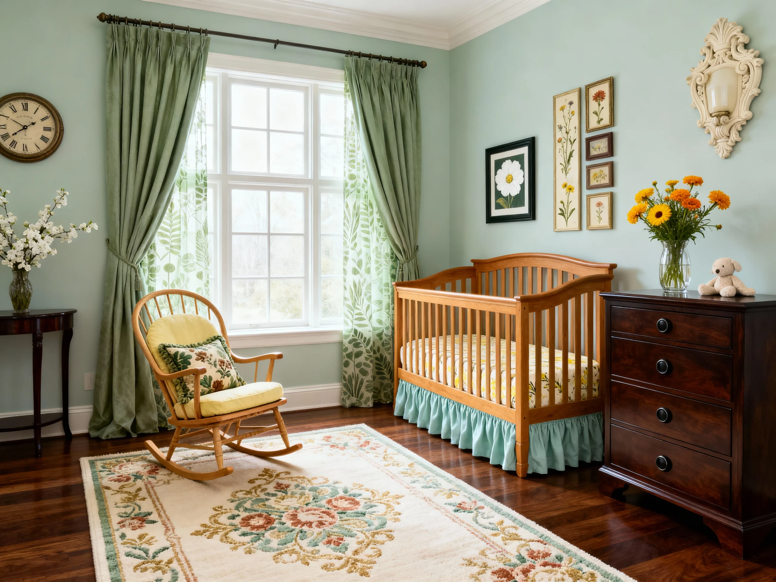 This room feels like a warm hug from the past. The floral wallpaper is stunning—it’s got that classic, slightly moody vibe that pairs so well with the lace-trimmed armchair. Can’t you just imagine rocking a little one to sleep here? The little sheep figurines on the windowsill are the cutest finishing touch. It’s proof that “old-fashioned” can feel totally sophisticated and cozy.