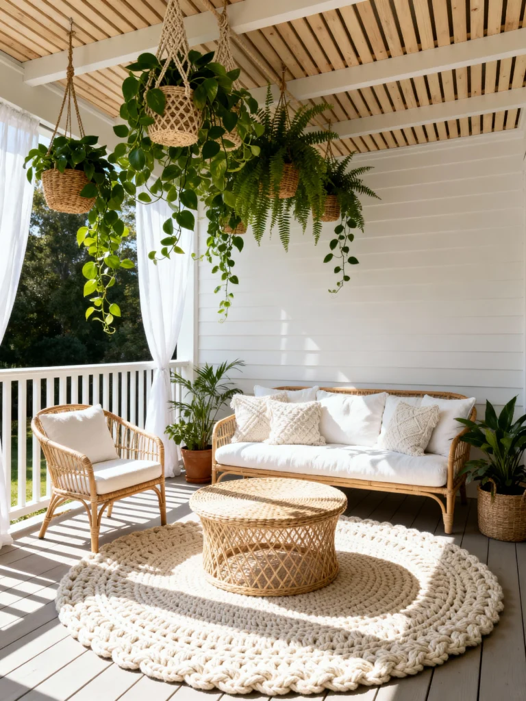 If you’re looking for that bright, airy, and utterly serene vibe, this is it! Doesn’t this space just whisper “relax”? The combination of the white-slatted ceiling, the flowing sheer curtains, and the crisp white upholstery is pure elegance. The star of the show, though, has to be the natural rattan furniture and that oversized, chunky-knit rug. It brings in so much wonderful texture! And can we talk about the greenery? Hanging pothos and ferns instantly make the space feel alive and fresh. It proves you don’t need a huge yard to create a stunning, cozy corner. This is the perfect spot for sipping your morning coffee or reading a good book. It’s chic, inviting, and wonderfully simple.