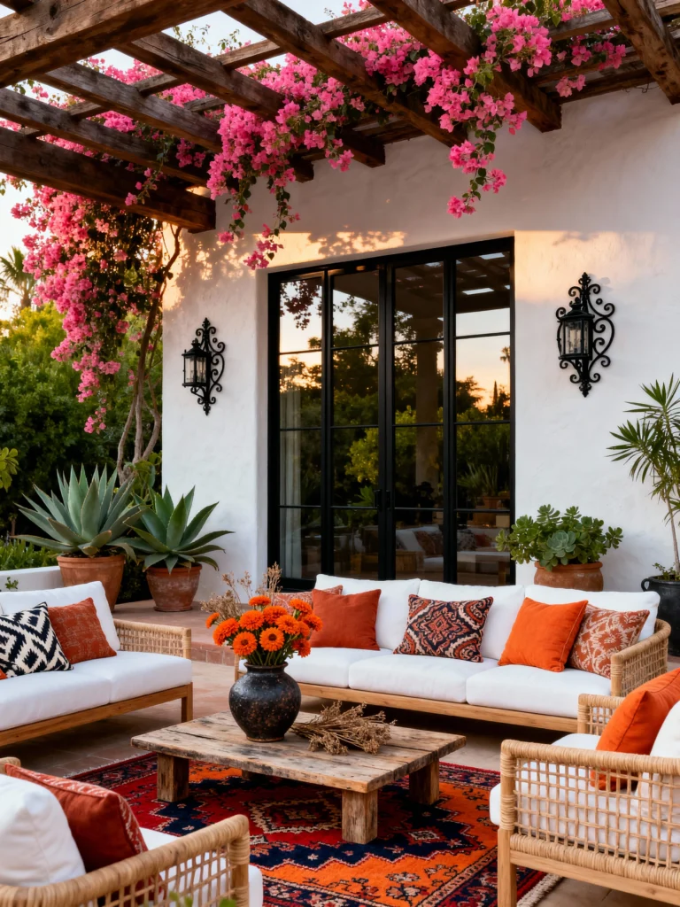 This image is the definition of “outdoor drama”! The mature bougainvillea vine climbing over the wooden pergola is absolutely breathtaking, spilling a waterfall of vibrant pink color against the crisp white wall. It instantly creates a luxurious, romantic atmosphere. The seating is stylish and comfortable with crisp white cushions, but they’ve added warmth and personality with the deep orange pillows and a striking, patterned rug in coordinating colors. The rustic wooden coffee table and the large terracotta planters housing agaves and succulents ground the look. Flanked by those gorgeous black iron lanterns, this space transitions beautifully from a sunny daytime retreat to a moody, elegant evening lounge.