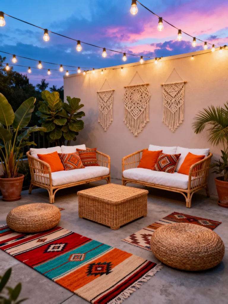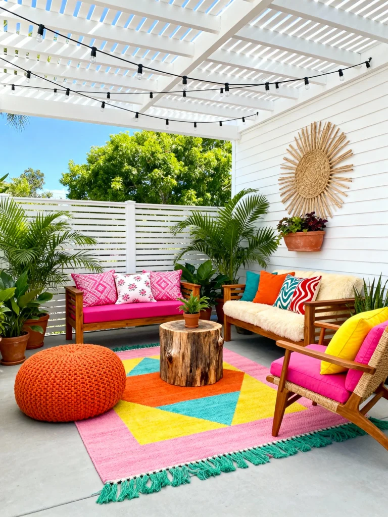 This patio is a blast of colour and youthful energy. The clean, white-slatted pergola and siding are a brilliant canvas for that super-saturated, geometric rug in pink, yellow, and turquoise. The wooden seating is instantly jazzed up with vibrant hot pink and sunny yellow cushions. That giant, textured orange pouf is such a fun, inviting element! The lighting is kept simple with string lights, perfect for an evening glow. And check out that amazing woven sunburst wall hanging! It’s playful, bright, and completely captures a modern, tropical-meets-boho aesthetic. This is the spot for energetic gatherings and good times!