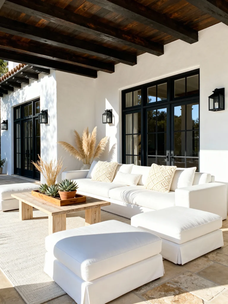 If your style leans towards sophisticated and serene, take notes from this stunning setup! It’s giving us major Spanish Colonial vibes with a super-sleek modern twist. The contrast between the brilliant white stucco walls and the dark, heavy wooden beams overhead is incredibly dramatic and chic. They kept the palette almost entirely monochrome with the plush white outdoor sectional—imagine sinking into that! Texture is key here: soft rug, woven pillows, and natural pampas grass and dried arrangements. It keeps the all-white from feeling sterile. The black framed doors and lanterns are the perfect bold punctuation marks. It feels luxurious, airy, and a little bit like a high-end resort.