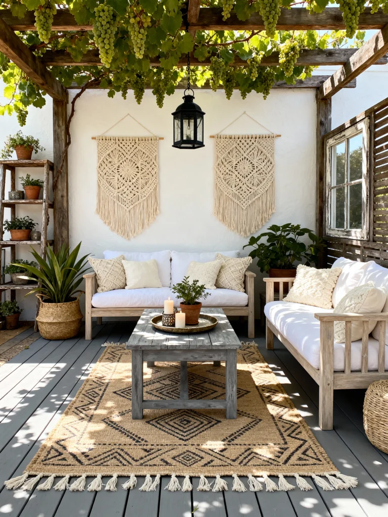 This space feels incredibly cozy and lived-in. The pergola, draped with actual grapevines, is a dreamy way to add natural shade and beauty—talk about a unique ceiling! The furniture is made of beautiful weathered wood, and the cushions are all soft, inviting whites and creams. The macrame wall hangings and the textured jute and woven rug really nail that casual, bohemian aesthetic. They’ve used planters and a wooden ladder shelf to bring in a lovely amount of greenery without overwhelming the space. It’s perfectly styled with an antique-looking lantern and candles for that ultimate peaceful, evening atmosphere. So lovely and relaxing!