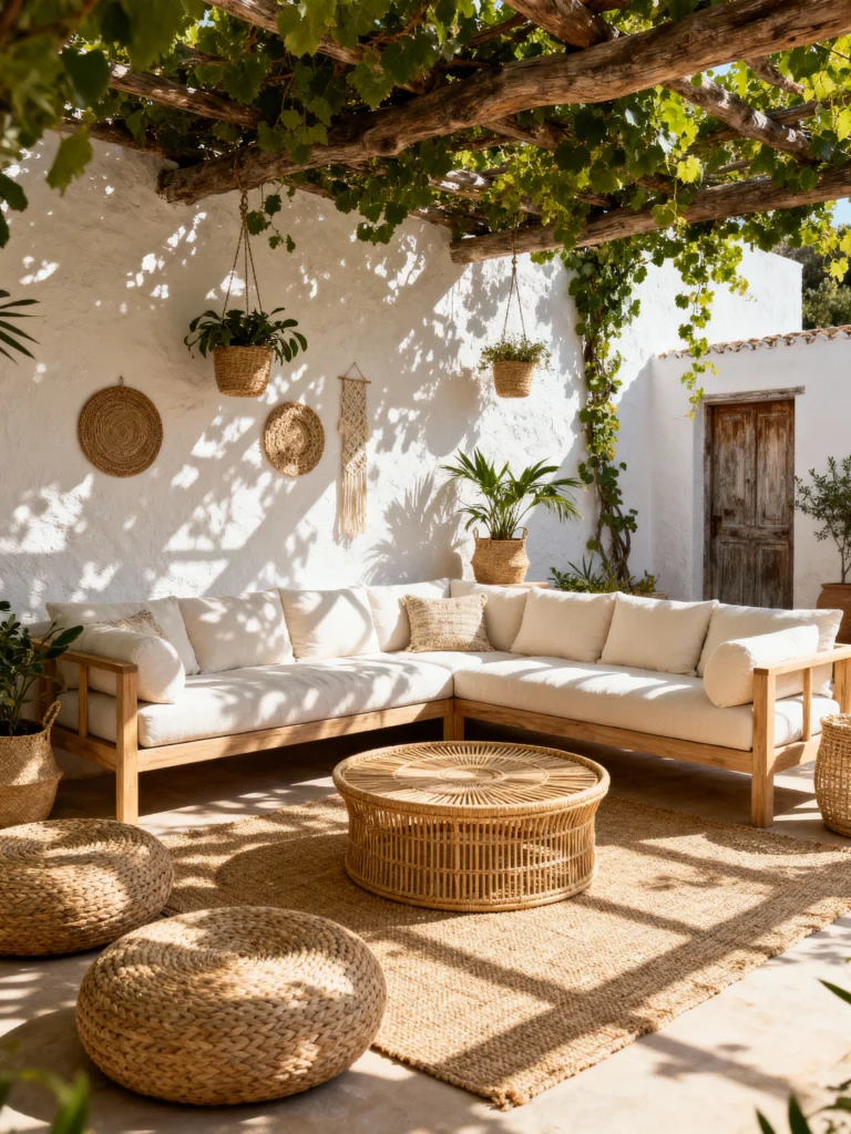 This is the ultimate laid-back, organic vibe! Everything here is about natural materials and light, airy colours. The sturdy, light-wood sectional is beautifully paired with a woven rattan coffee table and these fantastic round floor poufs. The overall look is effortlessly stylish. The jute rug anchors the space, while the grapevine-covered pergola creates stunning dappled light and shadows on the white textured wall—it’s so visually interesting! The small touches, like the woven wall decor and simple hanging plants, complete the look. It’s a gorgeous example of how to create a peaceful, sun-drenched spot that feels connected to nature.