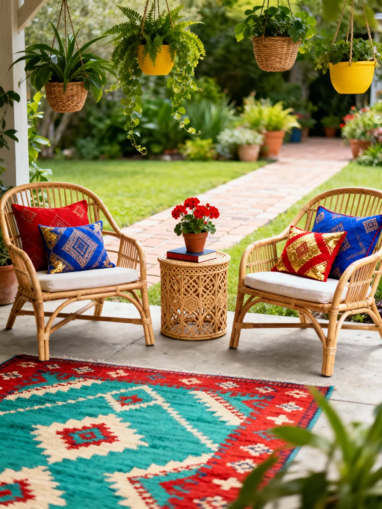 Even the smallest outdoor spaces can make a huge impact, and this picture proves it! This setup is all about cozy comfort and a touch of exotic flair. The natural rattan chairs are incredibly versatile and perfectly comfortable with their simple white cushions. But the magic is in the details: the teal and red patterned rug and those fantastic, luxurious throw pillows in shimmering red and royal blue! They instantly elevate the whole look. The small, carved rattan side table is a perfect perch for a little potted plant and a stack of books. It’s an inviting, colorful spot that would make a lovely little retreat at the end of a brick pathway.