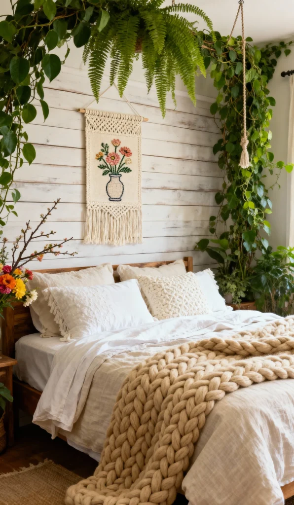 This room is giving me serious jungle-boho vibes, and I’m obsessed! It’s all about bringing the outdoors in. The lush hanging ferns and climbing ivy create a magical, cozy canopy over the bed. The chunky, hand-knitted throw and the macramé wall hanging bring in tons of inviting texture, perfectly contrasting the shiplap-style wall. It’s relaxed, earthy, and so incredibly inviting. If you’re looking for a peaceful, nature-filled escape, take notes from this stunning space!