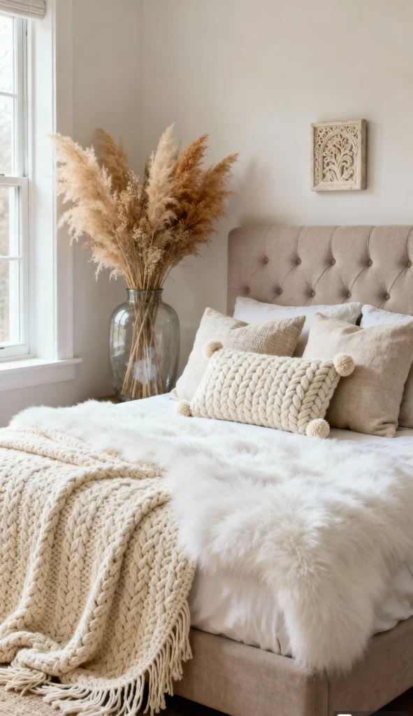 This bedroom is giving me major “sleep-in-all-day” vibes! It’s all about layering textures here to create that warm, inviting feel. Check out that chunky knit throw draped over the bed—it looks so substantial and cozy. Then, you have the plush, creamy faux fur rug adding another level of softness. Even the pillows are doing the work, especially that adorable knitted oblong pillow with pom-poms! The tall vase of dried pampas grass is the perfect natural, earthy touch, grounding the whole look. It’s a beautiful masterclass in using different whites and beiges to create depth without needing bright color.