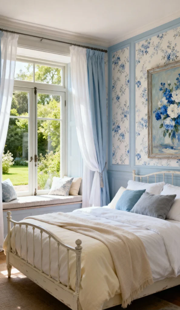 This room feels like a breath of fresh air, doesn’t it? The French-style windows opening onto a lush garden are truly the star. The light chippy white bed frame and soft color palette keep the focus on the beautiful outdoor view. It uses that same calming light blue and white color scheme, with delicate floral panels framing the headboard area. The mix of flowing sheer and heavy blue curtains, plus the cozy window seat, makes this the ultimate serene sanctuary.