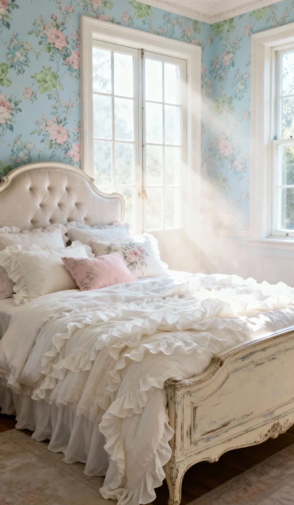 The sunbeam streaming in elevates this whole room! This is another beautiful example of a light, romantic shabby chic look. The stunning floral wallpaper in blues and pinks sets a cheerful tone. The antique-style bed with its button-tufted headboard is gorgeous, but the real star is the abundance of ruffled white and creamy bedding. It looks like sleeping on a cloud! The subtle pink floral throw pillow is the perfect tiny pop of color.
