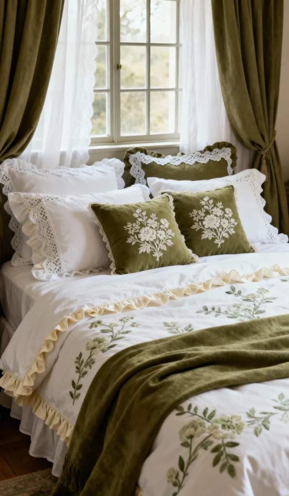 This close-up shows how powerful a limited color palette can be. The deep, earthy olive green velvet curtains and pillows add richness and depth. Paired with the crisp white bedding featuring delicate lace trim and embroidery, the result is effortlessly sophisticated. The embroidered floral details on the pillows and duvet feel very intentional and high-end. It’s a gorgeous, subtle way to bring a classic, natural feel into your bedroom.