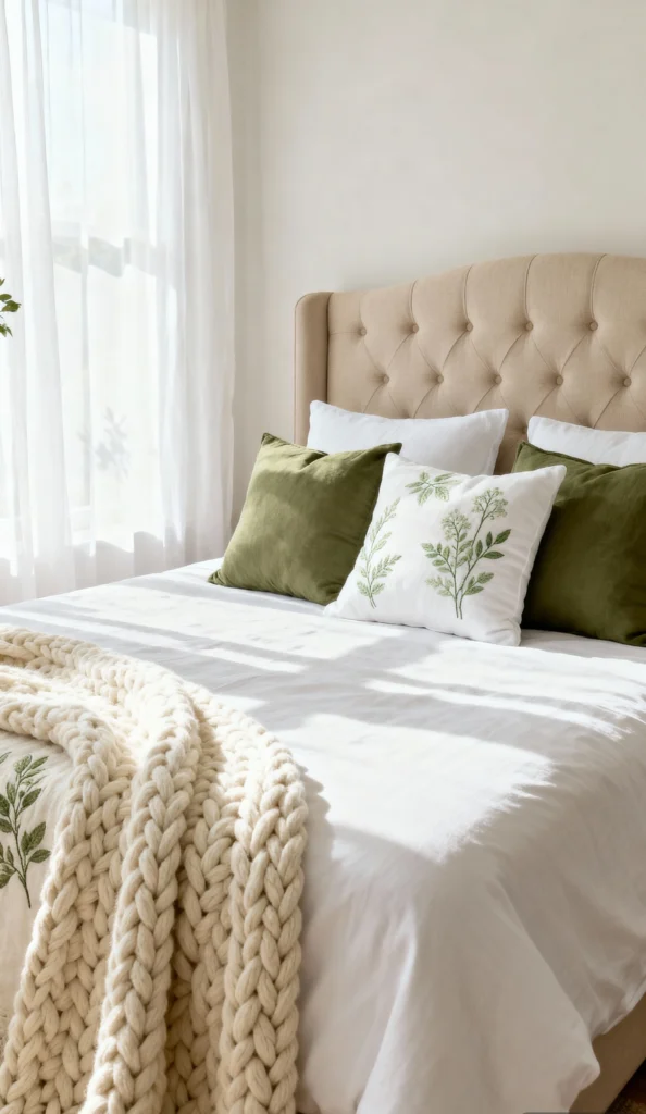 The clean, white bedding is the perfect canvas for the pops of mossy olive green in the throw and pillows. I especially love the single embroidered botanical pillow—it’s a chic focal point. The tufted, linen headboard adds that classic soft texture. The light flooding in through the window and the chunky knit blanket give it an immediate sense of warmth and peacefulness. Simple, stunning, and serene.