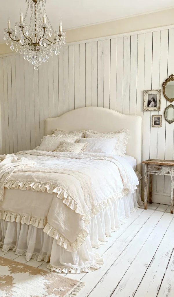 This space is the quintessential shabby chic dream. Everything is layered in soft, creamy whites—from the painted wood plank wall to the ruffled bedding and skirt. The distressed white wood floor enhances the airy, vintage feel. The crowning touch is that beautiful, sparkling crystal chandelier, adding a touch of elegance and sparkle to the rustic textures. It’s feminine, delicate, and utterly timeless.