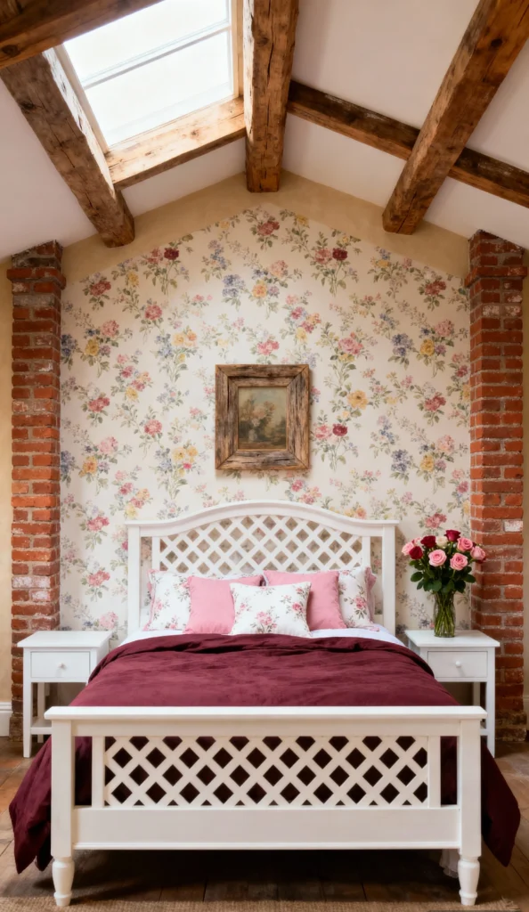 The lovely, vintage-inspired floral wallpaper serves as the perfect romantic backdrop. The white lattice-style bed and crisp white nightstands keep the look fresh and bright. What I adore is the contrast: the rustic wood beams and exposed brick columns add that necessary farmhouse texture, preventing the room from feeling too precious. The deep burgundy bedding and pink roses add a final pop of classic romance. So cozy and charming!