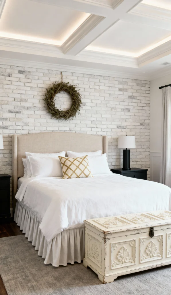 This room perfectly captures the essence of refined rustic style. Seriously, the whitewashed brick accent wall? I’m obsessed! It adds incredible texture and a beautiful, soft backdrop without feeling heavy. Layering soft white linen bedding on the tall, upholstered headboard creates an inviting cloud you just want to sink into. The vintage, distressed white trunk at the foot of the bed is such a charming, unique touch, and that simple olive wreath is the perfect organic accent to complete this peaceful, dreamy sanctuary.