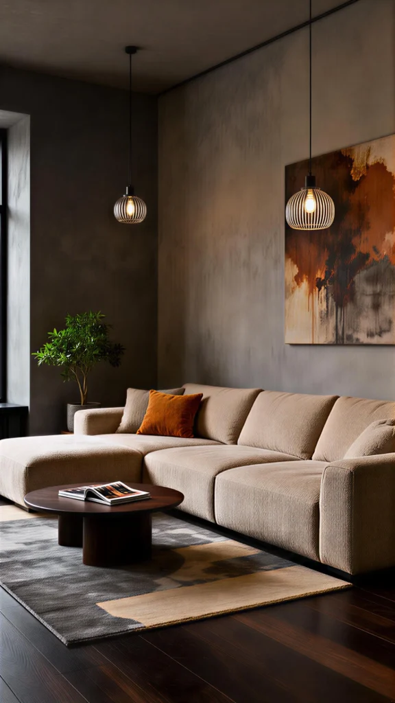 This living room is all about sophisticated calm. The taupe, textured walls and the plush, chunky sectional create a wonderfully tactile space. They’ve kept the palette soft, letting the deep wood floor and the abstract artwork provide grounding contrast. Those sleek pendant lights are the perfect touch, adding a modern glow without distracting from the overall serene, earthy feel.