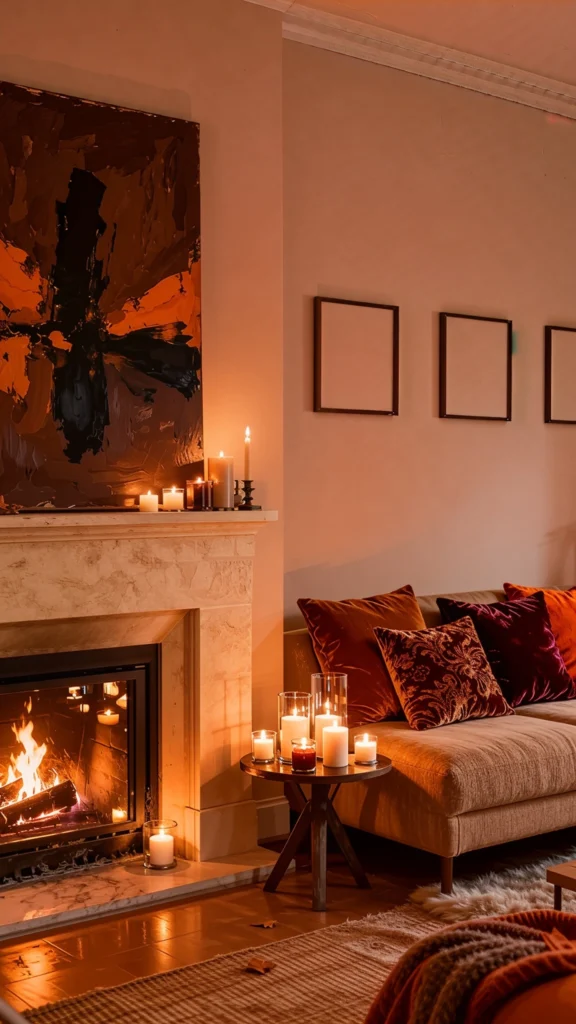 This image just screams cozy fall evenings! The natural fireplace is the focal point, casting a gorgeous, warm light that highlights the rich jewel tones in the velvet cushions. The massive abstract painting echoes those beautiful reds and oranges. The collection of lit candles on the small side table and the mantelpiece adds layers of soft, flickering light, making this space the perfect spot to unwind.
