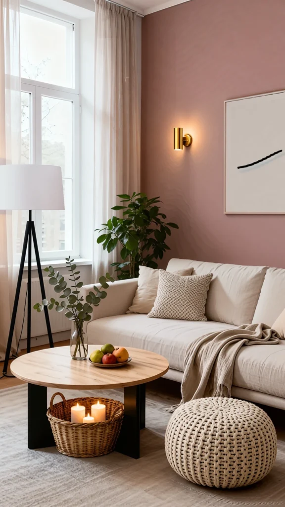 How gorgeous is this? The soft blush wall brings a subtle warmth that contrasts beautifully with the crisp white trim and sheer curtains. It’s light, airy, and inviting. The comfy sofa, the basket holding candles, and the chunky knit pouf add great texture, while the simple gold sconce and the clean-lined artwork keep things feeling modern and chic. This is the definition of relaxed elegance!