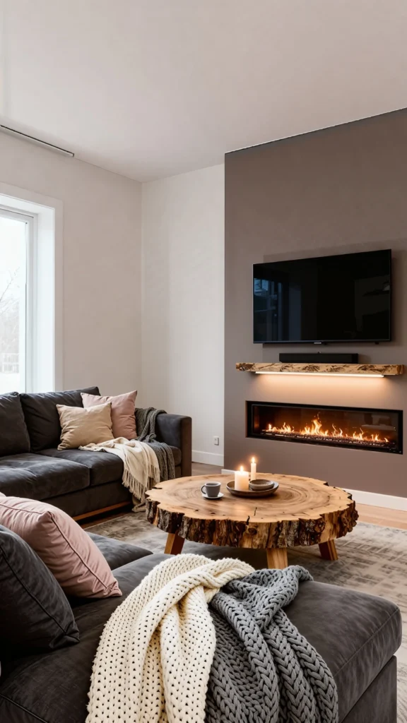 This is how you do modern warmth! That long, linear fireplace nestled into the wall is incredibly sleek, perfectly complementing the mounted TV above. The light wood shelf with the hidden lighting is a genius detail. The dark, plush sectional is softened beautifully by light, chunky knit throws and soft, blush-toned pillows. The live-edge wood coffee table adds an organic, grounding touch to the contemporary design.