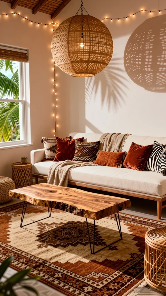 Get ready for vacation vibes! This bohemian living room is pure sunshine and texture. That giant, woven pendant light casts amazing shadows, and the string lights add an instant festive mood. We love how the wooden coffee table with its organic edge sits on the beautifully patterned rug. The mix of printed and velvet cushions on the white sofa is spot-on—especially that unexpected zebra print!