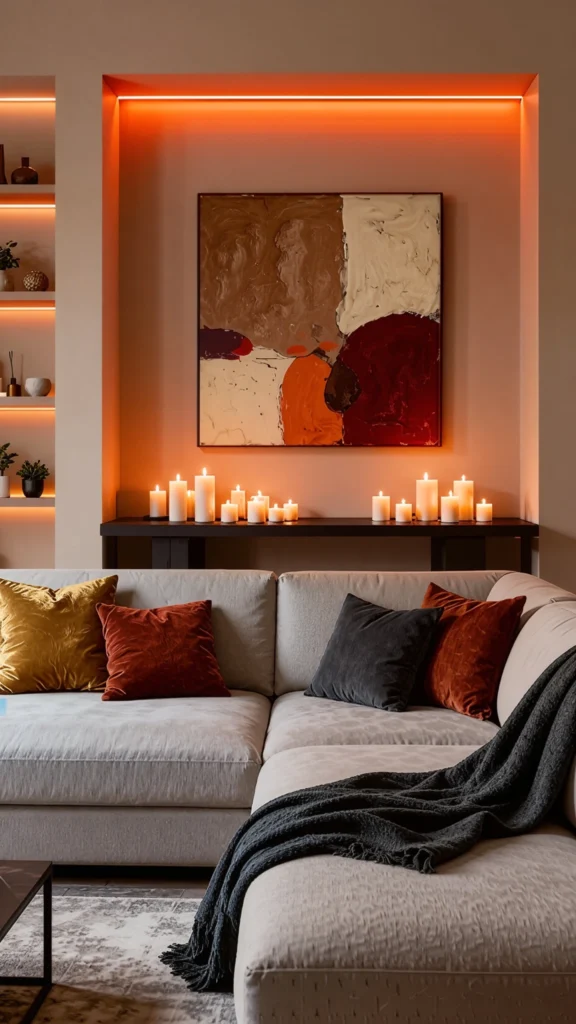 Talk about creating a mood! The key feature here is the incredible ambient lighting—especially the orange neon strip framing the artwork. It instantly draws your eye and casts a beautiful, warm glow. The arrangement of candles on the floating shelf below the painting adds multiple layers of soft light, making the plush sectional and velvet-accented cushions look incredibly inviting for a relaxed evening in.