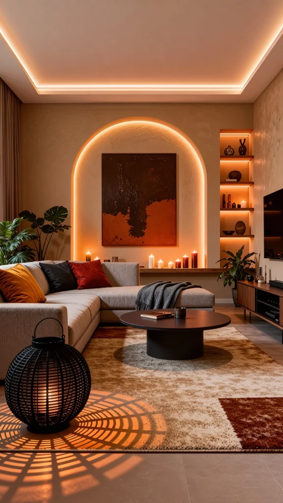 The architectural feature here—the arched niche—is absolutely stunning! Lined with warm, hidden lighting, it transforms a simple wall into a gallery display. The soft, glowing arch and the recessed ceiling lighting create a powerful, warm effect. The black lantern in the foreground adds a beautiful shadow pattern to the light rug, giving the whole room depth and an irresistible, moody charm.
