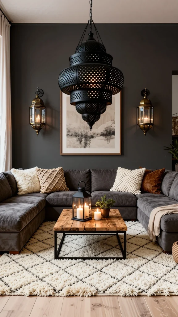 This living room goes for bold sophistication with its dark gray walls and plush velvet sectional. The showstopper is definitely the huge, black, tiered Moroccan-style lantern, perfectly balanced by the two brass-and-glass wall sconces. The bright, fluffy area rug and textured cushions contrast beautifully with the dark palette, keeping the space from feeling too heavy and adding a comfortable, hygge feel.