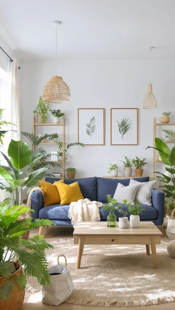 This room is another dream for plant parents! The deep navy sofa is the star, beautifully contrasted with pops of sunny yellow and crisp white throw pillows. The entire space is brought to life by the natural textures of the jute rug, wicker light, and, of course, a jungle’s worth of vibrant greenery. It’s inviting and full of life!