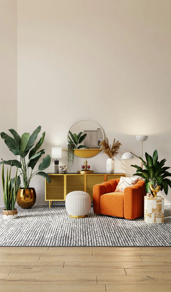 Can we talk about this gorgeous, gilded corner? The bold orange armchair paired with a shiny gold console and mirror is pure modern glam. It’s grounded by the soft, neutral pinks and the light patterned rug. This look is perfect if you want to mix natural tones with a bit of metallic shine for a chic, grown-up space.
