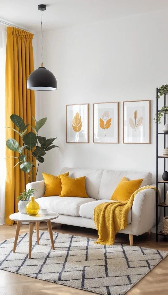 The crisp white sofa is the perfect backdrop for a vibrant injection of mustard yellow through those plush cushions, throw, and curtains. It’s such a modern and playful contrast with the black lighting fixture and the graphic monochrome rug. This proves you don’t need a lot of color to make a huge, cheerful impact.