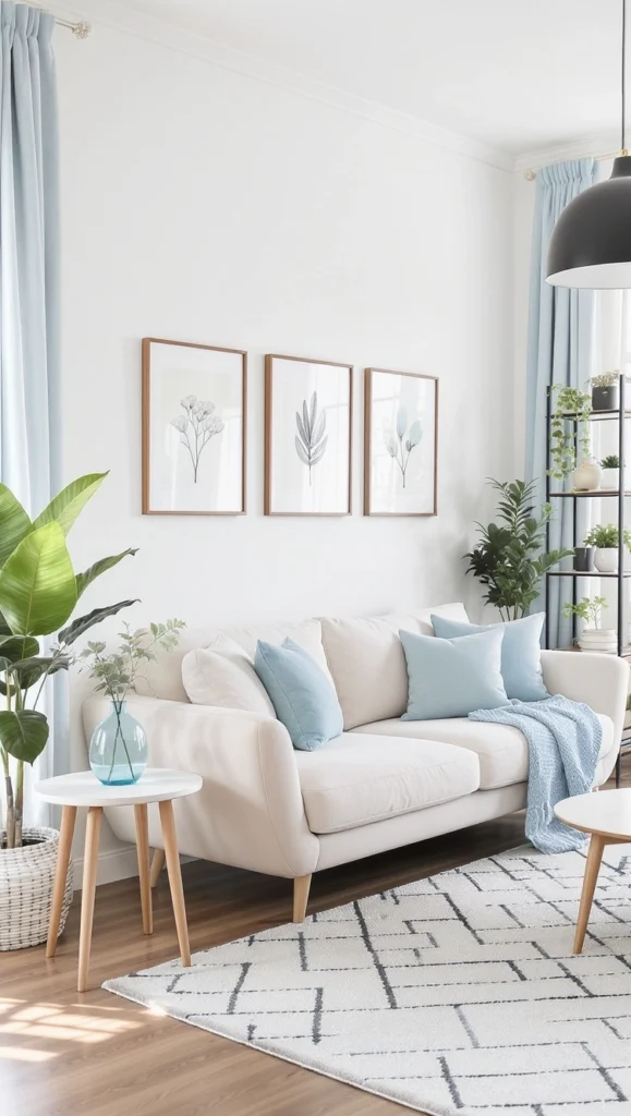 If you’re looking for a space that instantly brings a sense of calm, check this out. The soft, airy powder blue accents against the white walls and couch are so soothing. Paired with plenty of greenery and natural wood accents, this room feels like a fresh, quiet retreat. It’s a beautiful example of how pastel hues can create an elegant, tranquil atmosphere.